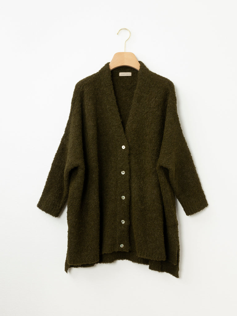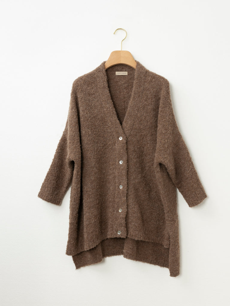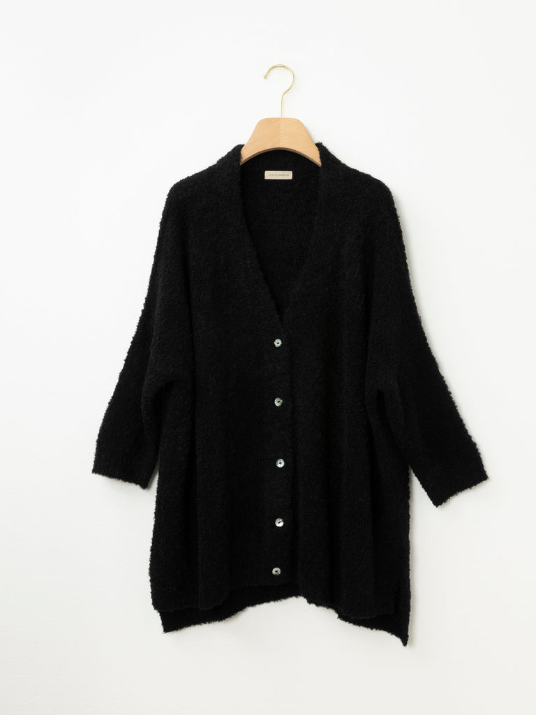 The Oversized Boucle Cardi is your throw-on-and-go layering piece. Crafted from a plush baby alpaca blend, it features a generous silhouette with drop shoulders, a button front and textural boucle finish. It’s the perfect combination of structure and softness – ideal for slow mornings, weekends away, or busy days on the move.